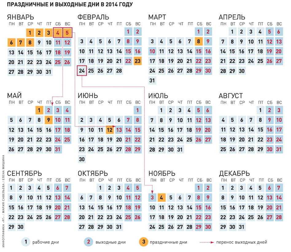 Выходные и праздничные дни в 2014 годуВ следующем году у россиян будет больше возможностей устроить себе мини-каникулы. К новогодним и майским выходным добавляются длинные уик-энды в июне и ноябре.